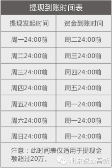 2)当日提现金额超过20万,将于下一个工作日24:00前到账。如遇法定节假日,则法定节假日后第一个工作日24:00前到账。